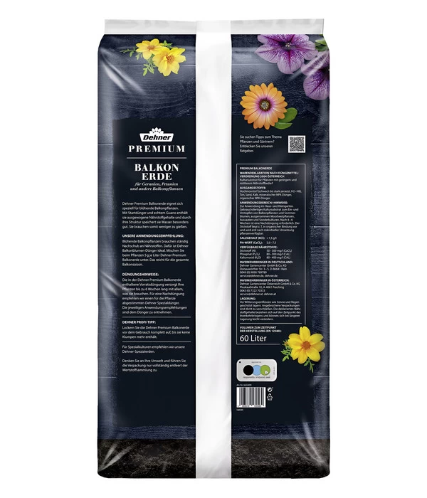 Jeder, der schon einmal blühende Balkonpflanzen in Töpfen und Kästen hatte, weiß, dass diese einen großen Bedarf an hochwertigen Nährstoffen haben, um uns den ganzen Sommer mit immer neuen Blüten zu beschenken. Deshalb verfügt die Dehner Premium Balkonerde über einen Startdünger, der Ihre Blühpflanzen die ersten 6 Wochen mit allen wichtigen Nährstoffen versorgt. Außerdem wurde die Spezialerde mit echtem Guano aufgedüngt. Das sind die Hinterlassenschaften der Seevögel an der Küste Perus, die seit langem als wertvoller, natürlicher Dünger bekannt sind. Besonders der hohe Anteil an den essentiellen Pflanzennährstoffen Phosphor und Stickstoff macht Guano so wertvoll. Sie werden es Ihren Pflanzen ansehen, wie wohl sie sich in der Dehner Premium Balkonerde fühlen.
