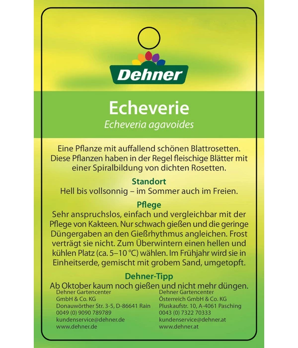 Echeverien sind eine der pflegeleichtesten Pflanzen fürs Zimmer. Sie bevorzugen Standorte mit viel Licht und direkter Sonneneinstrahlung, gedeihen aber ebenso im Halbschatten. Der Wasserbedarf der Echeverie ist gering. Da die sukkulente Pflanze das Wasser in ihren Blättern speichert, kommt sie längere Zeit ohne Wasser aus. Das Substrat darf und sollte sogar austrocknen bevor sie ihr wieder ein wenig Wasser geben. Eine Düngerzugabe von April bis September fördert das gesunde Wachstum, sollte aber schwach dosiert und nur etwa alle drei Wochen zugegeben werden. Ideal geeignet ist der Dehner Kakteen-Dünger. Im Sommer kann die Echeverie gerne draußen auf Balkon oder Terrasse stehen, sollte aber einen geschützten Standort erhalten. Um das Blütenwachstum anzuregen ist es ratsam der Zimmerpflanze in der winterlichen Ruheperiode eine Umgebungstemperatur von etwa 13°C zu verschaffen.