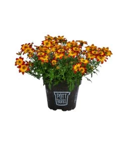 Mit der sonnengelben Blütenmitte und den in warmem Rostrot abgesetzten Blütenspitzen ist die Goldmarie im Pottburri®-Topf einer strahlende Sommer-Schönheit, die bei Ihnen Gartenbeete, Kästen, Töpfe und Hanging Baskets schmücken kann. Sie hat einen buschigen, leicht überhängenden Wuchs und kann eine Höhe von 30-60 cm erreichen. Und wer bei seinen sommerlichen Blumen-Arrangements nicht nur an die dekorative Wirkung, sondern auch an die Umwelt denkt, wird begeistert sein, dass der Topf, in dem die schöne Sommerblume zu Ihnen kommt, nicht aus normalem Plastik ist, den sie entsorgen müssen. Vielmehr wächst die Goldmarie im Pottburri®-Topf, der aus Naturfaserstoffen auf Basis von Sonnenblumenschalen besteht und somit zu 100 % biologisch abbaubar ist. Deshalb können Sie die Pflanze mit dem Topf ins Beet setzen, er zersetzt sich mit der Zeit, ohne umweltschädliche Stoffe zu hinterlassen. Lassen Sie deshalb bald die Goldmarie im Pottburri®-Topf ihre leuchtenden Blüten bei Ihnen entfalten und genießen Sie den Anblick von April bis zum Oktober!