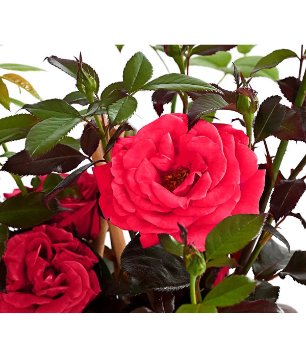 Stark duftende, rote Blütenpracht verpackt in kräftiges dunkelgrünes Laub – so präsentiert sich die Rose ‚Red Flame®‘. Es ist eine Kletterrose der jungen Generation des Rosenzüchters Nirp von 2001. Diese Kombination aus roter Blütenfarbe, Kletterrose und duftend ist sehr selten, das macht diese Rose so besonders und zu einem echten Schatz in Ihrem Garten. Die Blüten werden bis zu 12 cm groß und blühen von Juni bis zum Frost, wenn Sie verblühte Blüten immer abschneiden.