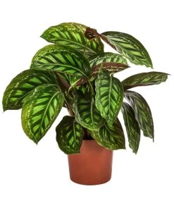 Dass sich tropische Dschungelpflanzen nicht nach der Prallsonne sehnen, liegt nahe, denn im Urwald werden die intensiven Sonnenstrahlen durch das dichte Blattwerk der Bäume gefiltert. Aber manche Pflanzen haben sich auf noch dunklere Standorte spezialisiert, was sie für alle Pflanzenliebhaber besonders wertvoll macht. Vor allem, wenn es sich um eine so handelt wie die Korbmarante ‘Flamestar‘. Die tiefgrünen Blätter sind wie mit kunstvollen Pinselstrichen in einem helleren Grün dekoriert, zu dem die Unterseite in einem dezenten Auberginen-Ton einen aparten Kontrast setzt. Und wenn bald aus der Zimmerecke, in der die Blattschmuckpflanze ihren Platz gefunden hat, am Abend ein leises Rascheln ertönt, wissen Sie, dass Ihre Calathea jetzt schlafen geht, denn das typische Aufstellen der Blätter ist oftmals mit einem leisen Rascheln verbunden. Freuen Sie sich auf einen ebenso dekorativen wie lebendigen Mitbewohner: die Korbmarante ‘Flamestar‘!