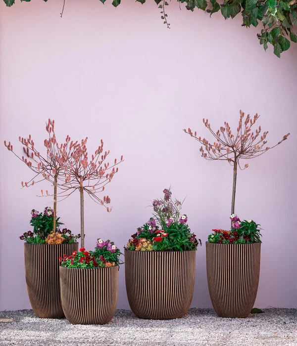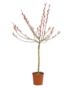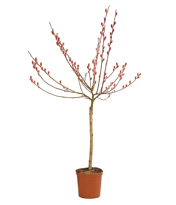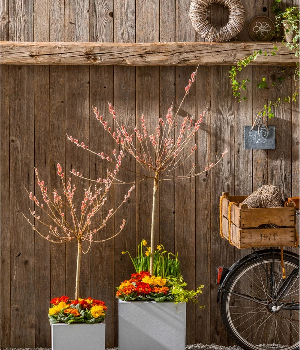 Diese Rotkätzchenweide wurde als Stämmchen gezogen und eignet sich deshalb besonders für die Kübelbepflanzung. Denn so bleibt in einem größeren Kübel noch genügend Raum, um zu Füßen der Rotkätzchenweide weitere Frühlingsblüher wie Hornveilchen, Vergissmeinnicht, niedrige Narzissen und andere zu pflanzen. Ist immer noch Boden unbedeckt, so legen Sie flauschiges Moos darauf und setzen zu Ostern noch einen Deko-Hasen dazu und fertig ist ein reizender Willkommensgruß neben der Haustür.