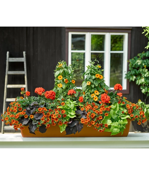 Mit ihrem aufrechten, mittelstarken Wuchs eignet sich die Geranien-Neuheit für große Töpfe, Kübel und natürlich dem klassischen Blumenkasten. Für Pflanzpartner ist die Geranie aufgeschlossen, diese sollten aber ähnliche Standort- und Pflegebedürfnisse haben wie die Pelargonie. Ein möglichst sonniger Standort und reichlich Wasser – und man kann kombinieren was gefällt. Für Ton-in-Ton Kombinationen macht der Elfenspiegel und das Wandelröschen eine gute Figur. Für den hängenden Charakter sorgt die orange Schwarzäugige Susanne. Wer es lieber bunt mag, kann die orangefarbene Geranie mit dem Husarenknöpfchen oder der Goldmarie und gerne auch mit dem zierlichen Zauberschnee oder der Dipladenie kombinieren.